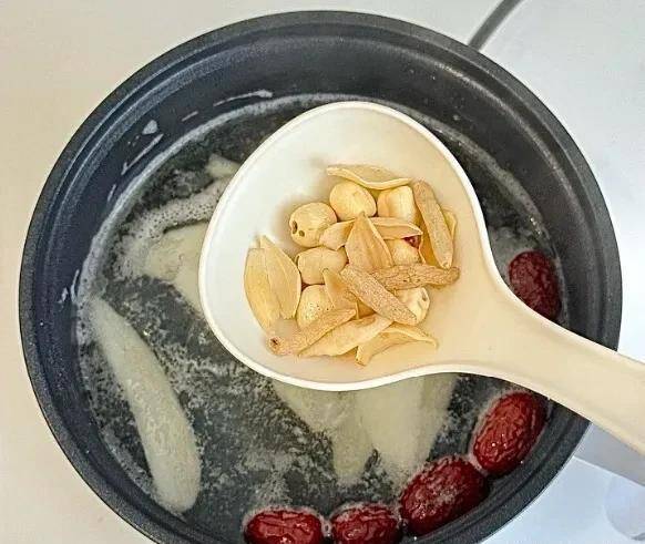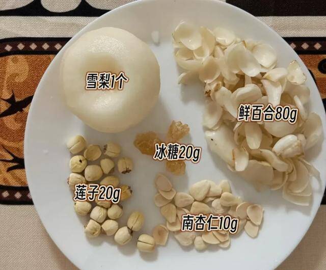 雪梨1个、干百合10克、南北杏6克、红枣枸杞等等,(不错遴荐我方可爱的加进去)冰糖小数(可选)