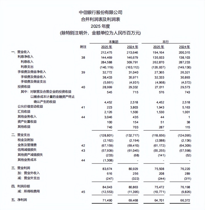 不外,将并吞报表与母行报表加以对照,年报呈现出另一层变化。2025年该行贸易收入为1941.64亿元,低于上年的2003.15亿元,该行净利润为647.01亿元,低于上年的663.72亿元。集团净利润保合手增长,但母行报表中的贸易收入和净利润均低于上年,集团报表与母行报表的变化并不同步。