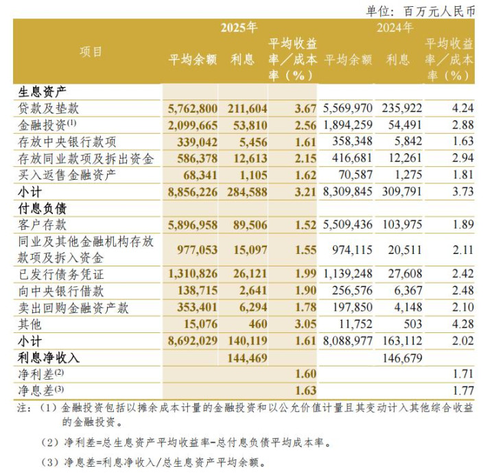 这种变化,也能从年度汇报中的息差与收益率变化中得到印证。中信银行2025年度汇报判辨,集团利息净收入为1444.69亿元,较上年减少22.10亿元,下落1.51%,贷款及垫款平均收益率由4.24%降至3.67%,金融投资平均收益率由2.88%降至2.56%,繁殖资产平均收益率由3.73%降至3.21%,而付息欠债老本率由2.02%降至1.61%。从年报数据看,总繁殖资产相关收益率降幅高于付息欠债老本率降幅。