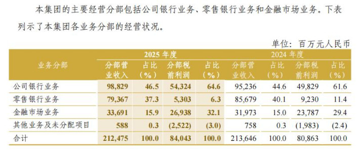 零卖银行利润孝敬的变化,是中信银行2025年度汇报中一个值得柔软的所在。按分部数据来看,2025年公司银行业务贸易收入为988.29亿元,较上年增长,分部税前利润为543.24亿元,较上年增长;金融阛阓业务贸易收入为336.91亿元,分部税前利润为269.38亿元,均高于上年。零卖银行业务则不同,贸易收入为793.67亿元,低于上年的856.79亿元,分部税前利润为53.03亿元,低于上年的92.30亿元。