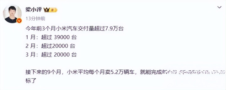 博主“梁小评”的动态截图 · 博主发布的小米汽车录用量及办法分析内容