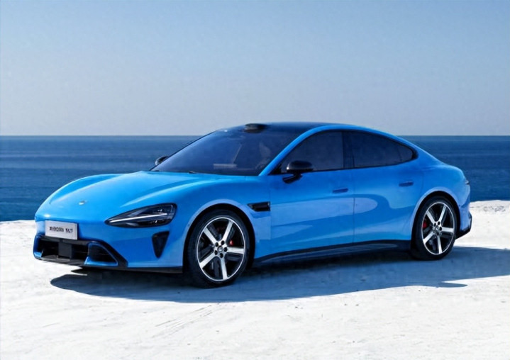 蓝色小米SU7汽车 · 蓝色小米SU7停在海边白色大地上
